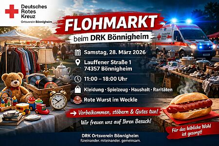 Am Samstag, 28.03.2026, findet von 11:00 bis ca. ca. 18:00 Uhr unser kleiner Garagenflohmarkt am Alten Feuerwehrhaus Bönnigheim, Lauffener Straße 1 in Bönnigheim, statt. Der Erlös kommt unserem DRK Bönnigheim für die Bewältigung und Umsetzung unserer vielseitigen Aufgaben u.a. Helfer vor Ort, Sanitätsdienste, Notfalleinsätze, zugute. Wir freuen uns sehr Sie an diesem Tag begrüßen zu dürfen. Zur Stärkung bieten wir unsere beliebte Rotkreuz-Wurst im Weckle an.