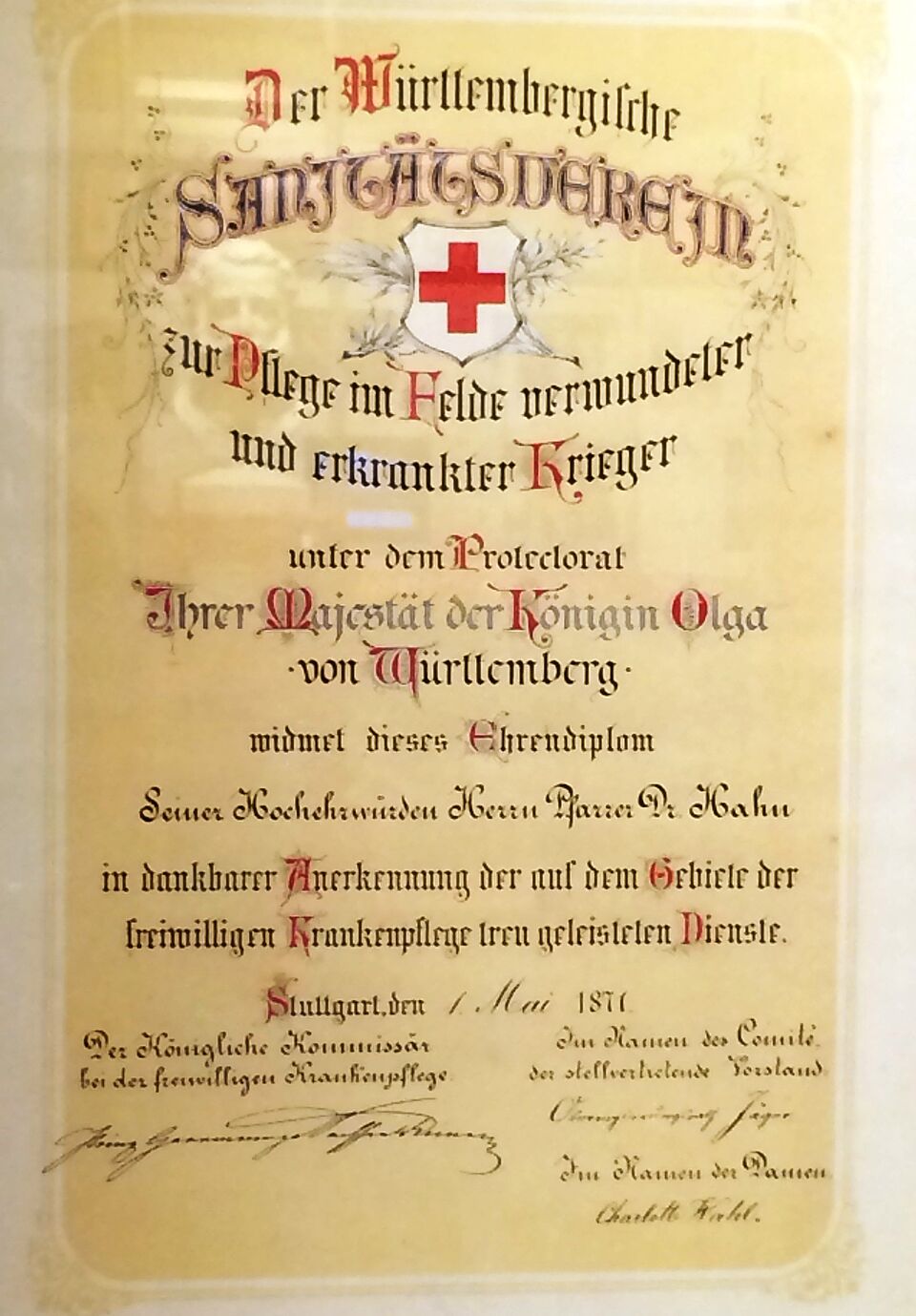 Am 14.10.1863 trifft sich Henry Dunant in Stuttgart mit Pfarrer Hahn. Pfarrer Hahn reist zur Internationalen Konferenz nach Genf und gründet 1863 den Württembergischen Sanitätsverein, die erste nationale Rotkreuz-Gesellschaft der Geschichte. Im folgenden Jahr unterzeichnete Hahn für das Königreich Württemberg die erste Genfer Konvention. Hahn erhielt für sein Engagement zahlreiche Orden und Auszeichnungen.